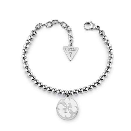 This white enamel beaded GUESS bracelet features a 4-G twist logo charm.