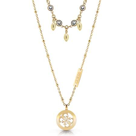 This double Gold GUESS necklace features crystal and teardrop beads and a 4-G logo charm on the lower section.