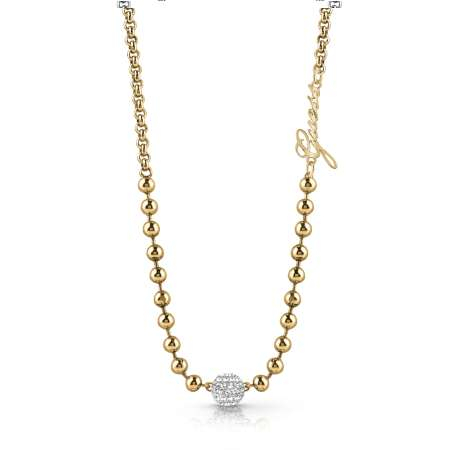 This 16-18" GUESS Gold bead and chain mix necklace features a GUESS logo charm and pave ball in the centre.