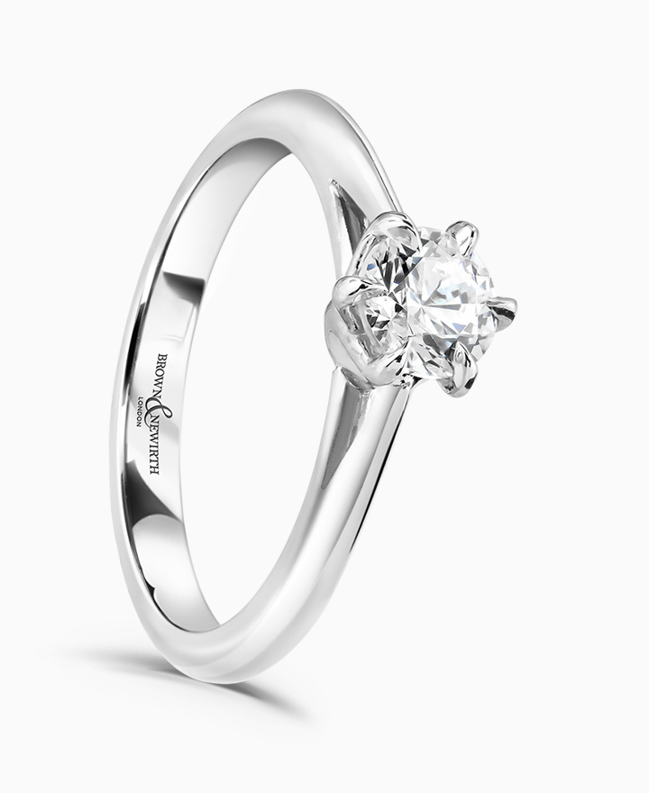 Handcrafted by Brown & Newirth; inspired by nature, organic lines wrap around embracing a round brilliant cut diamond, presented here on a classic court band. 0.50ct. Part of the Entwined Collection.