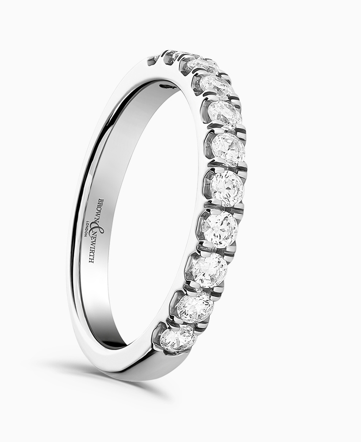 Handcrafted by Brown & Newirth; round brilliant cut diamonds adorn 50% of this straight edged band. Total carat weight 0.63ct