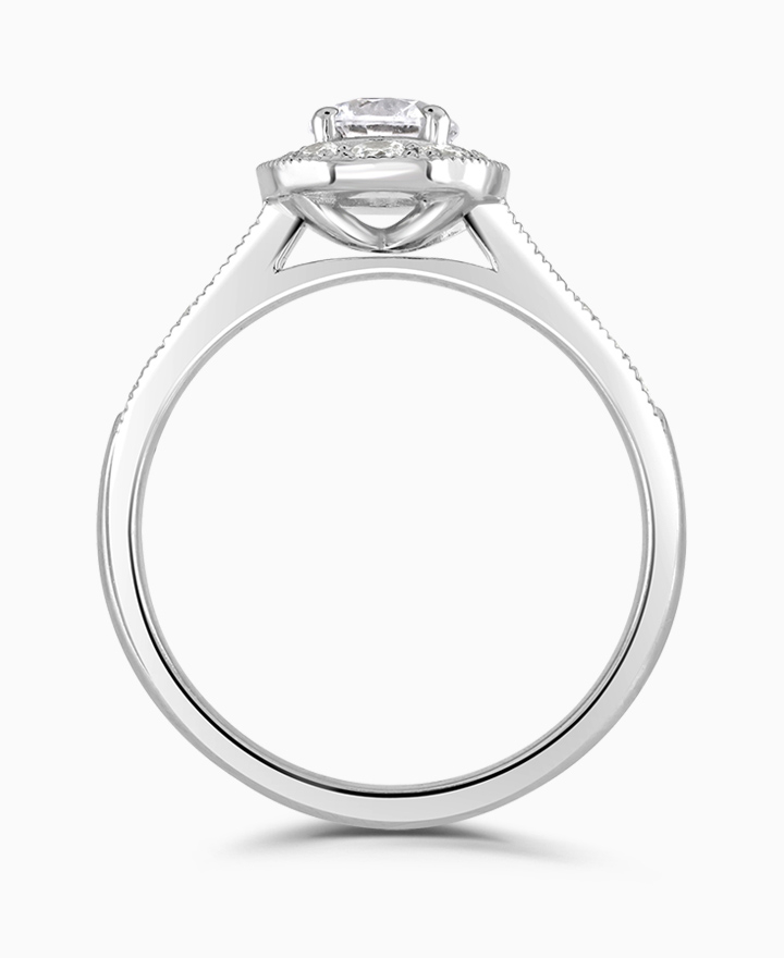 Handcrafted by Brown & Newirth; an oval shaped diamond halo frames the round brilliant cut diamond, presented here with diamond set shoulders. Centre 0.50ct, total 0.80ct. Part of the Vintage Collection