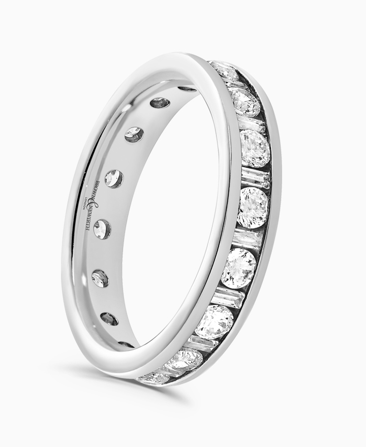 Handcrafted by Brown & Newirth; a captivating mix of rectangular baguette and round brilliant cut diamonds adorn the full hoop of this square edged band. Total carat weight 1.5ct
