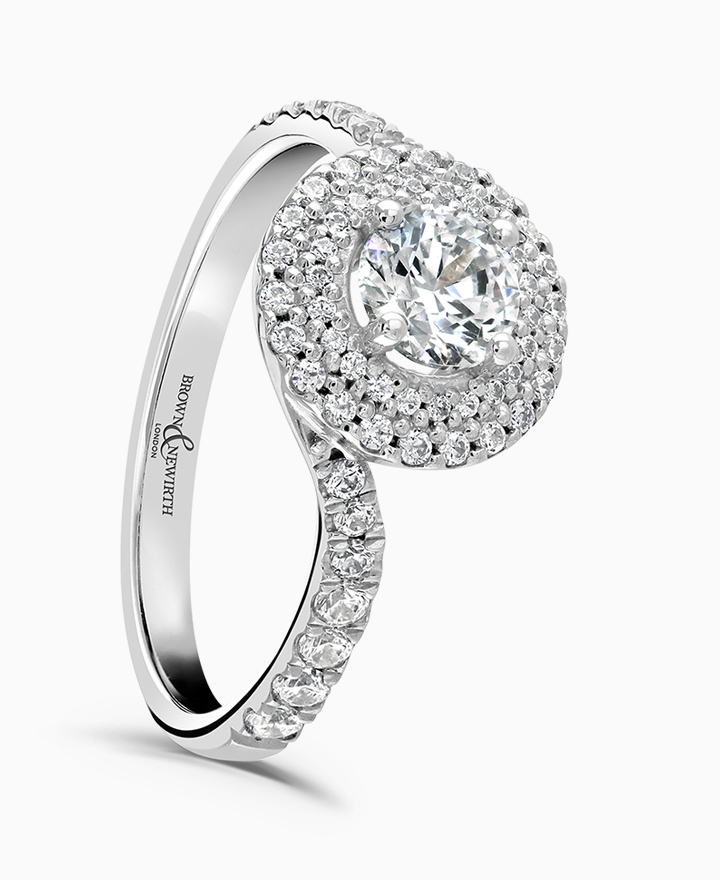 Handcrafted by Brown & Newirth; inspired by nature, organic lines twist up to embrace a round brilliant cut diamond with a double diamond halo, presented here with diamond shoulders. Centre 0.50ct, total 0.82ct. Part of the Entwined Collection.