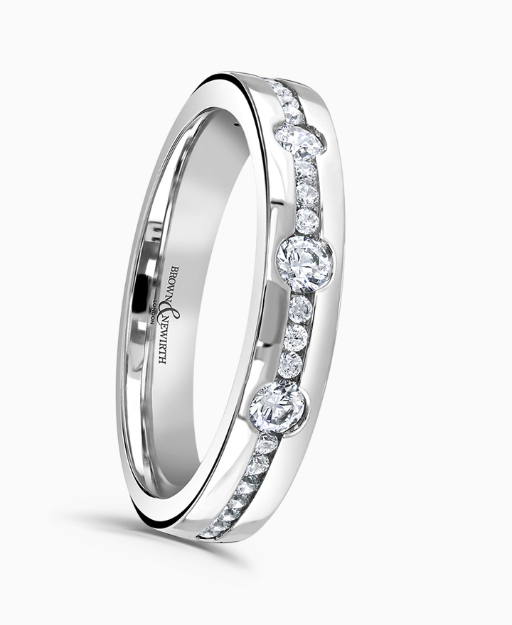 Handcrafted by Brown & Newirth; graduating round brilliant cut diamonds adorn 45% of this square edged band. Total carat weight 0.33ct
