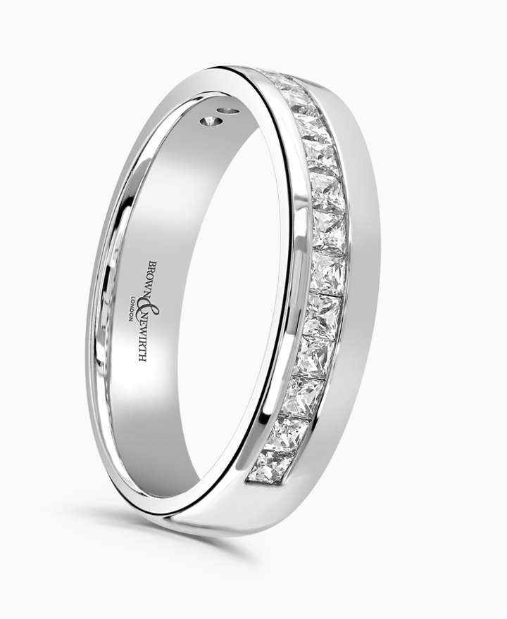 Handcrafted by Brown & Newirth; square princess cut diamonds sit edge to edge, offset adorning 50% of this modern court band. Total carat weight of .50ct Total carat weight 0.50ct