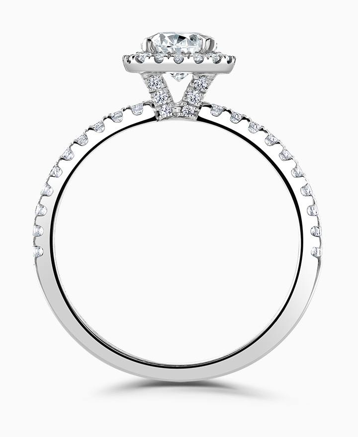 Handcrafted by Brown & Newirth; a diamond halo frames the round brilliant cut diamond, presented here with diamond set shoulders. Centre 0.70ct, total 1.04ct.